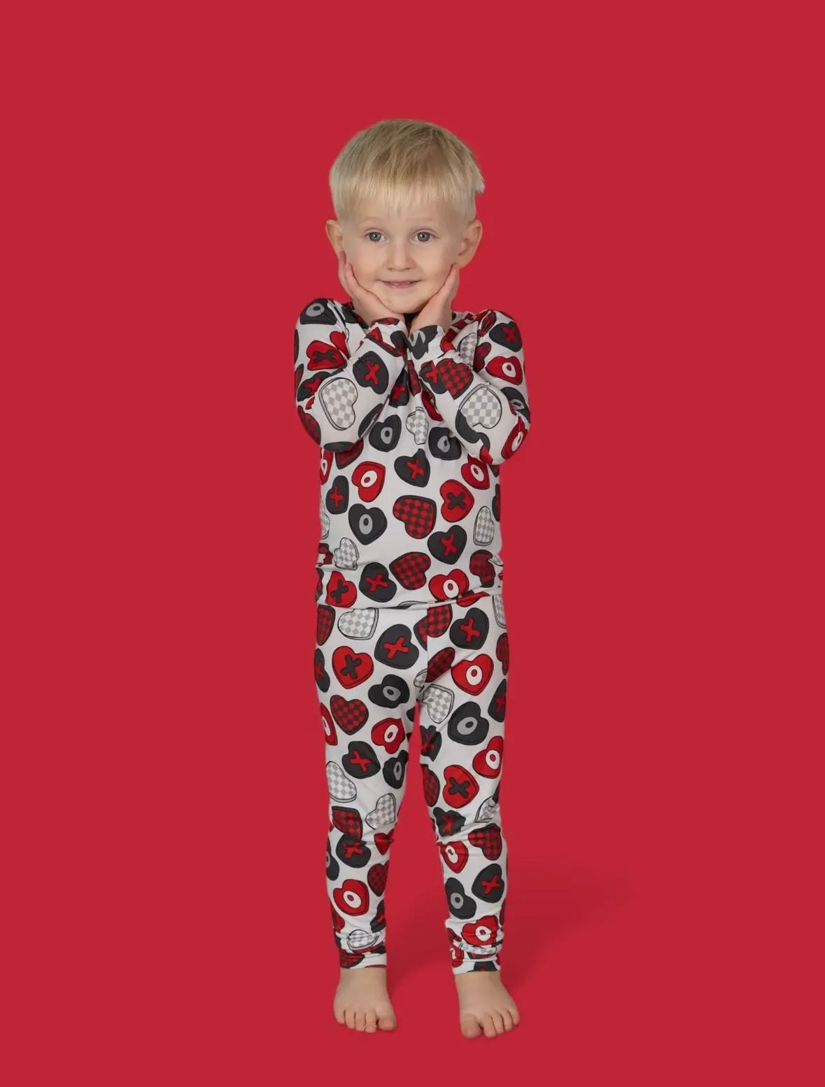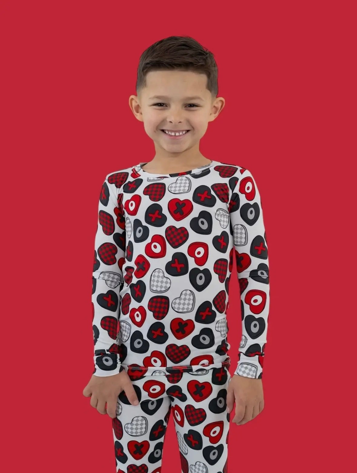 Cozy comfort with a pop of love! The Cross My Heart Dream Set features a long sleeve top and matching pants covered in playful hearts and X’s in shades of red, black, and white. Made from our signature buttery-soft bamboo fabric, this set is stretchy, breathable, and perfect for lounging, playing, or drifting into sweet dreams.