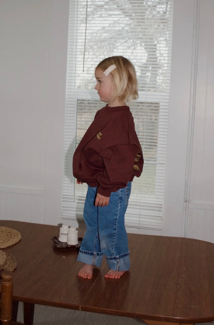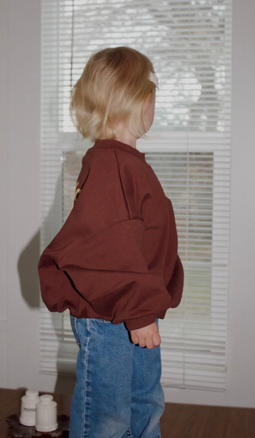the breakfast club crewneck feels like something pulled from a kitchen drawer in a house that’s held generations of sticky-finger mornings. soft cotton. warm brown. the kind of piece that feels already lived-in, like it belonged to an older sibling long before it found its way to your little one.