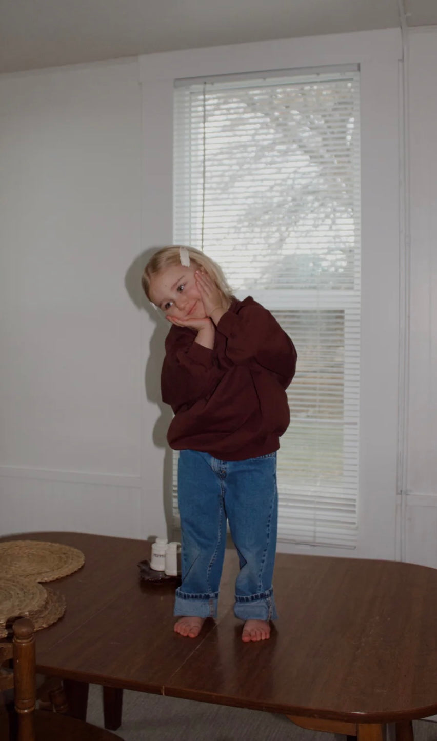 naturally oversized with long, slouchy sleeves perfect for rolling, it’s made for slow mornings on the couch, walks with dad, grocery runs, building block towers on the rug, and all the in-between crumbs that make a childhood real.
